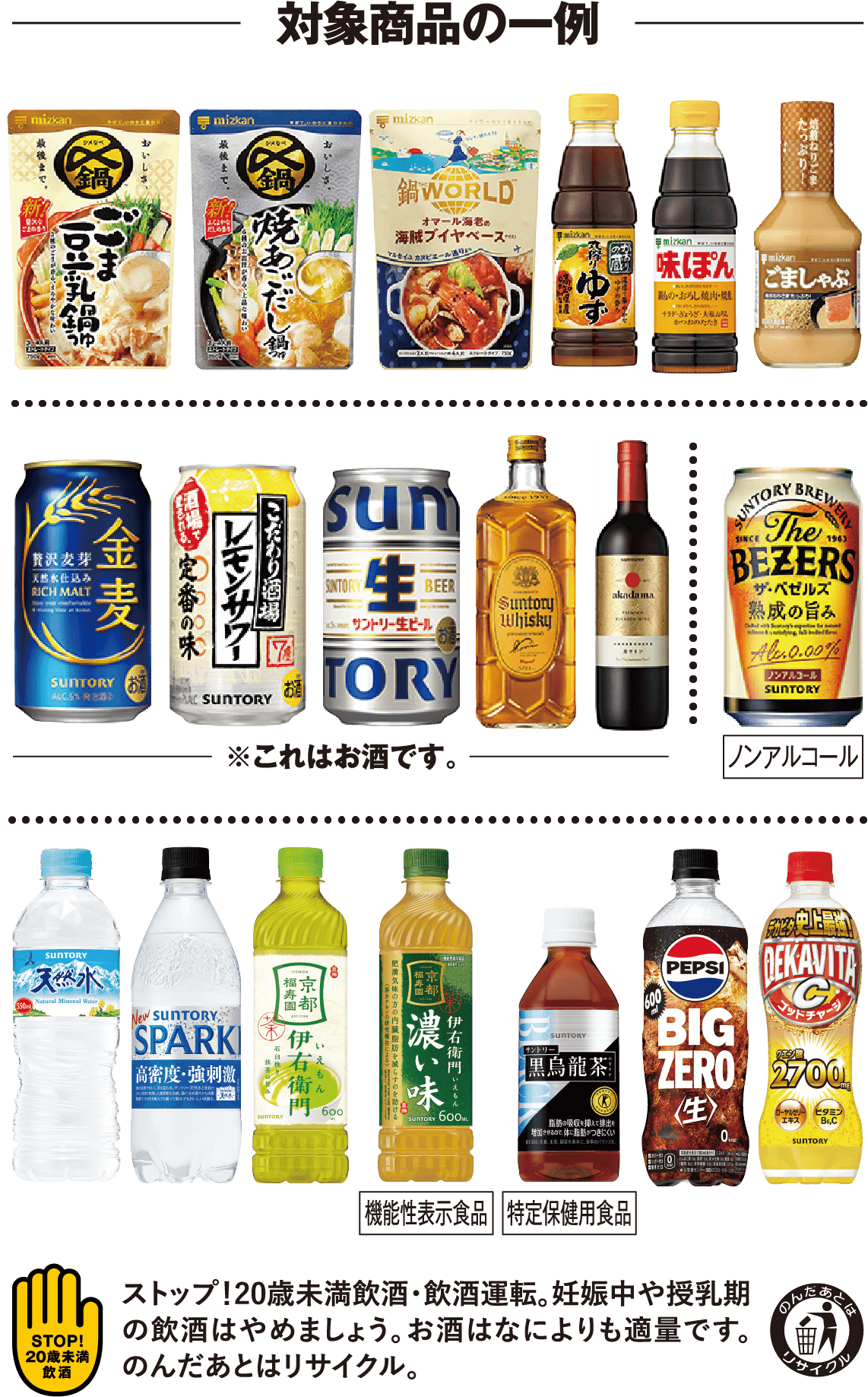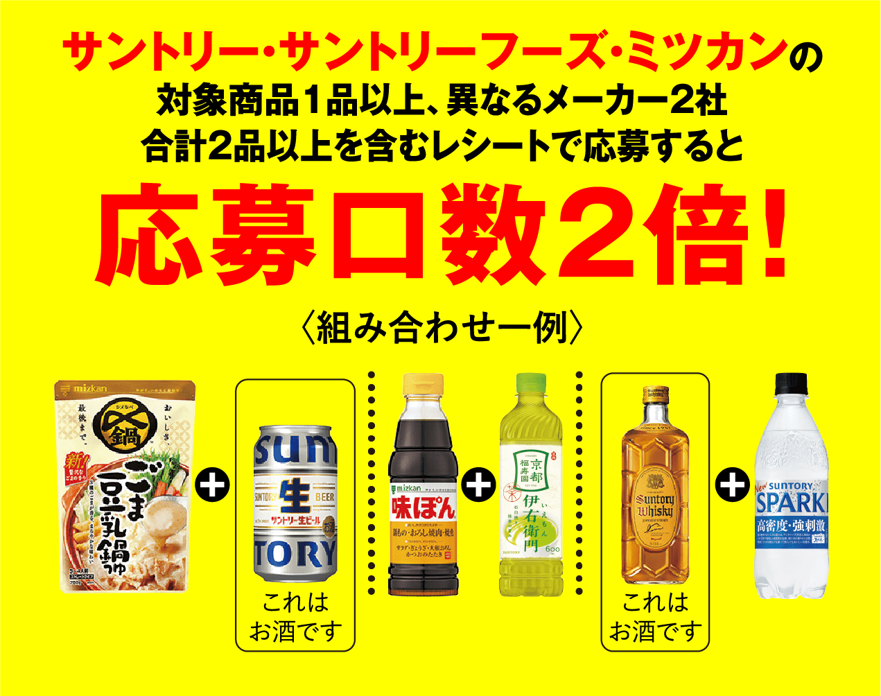 - サントリー株式会社・サントリーフーズ株式会社・株式会社Mizkanが同時期に実施している他のキャンペーンとは重複当選できない場合がございます。